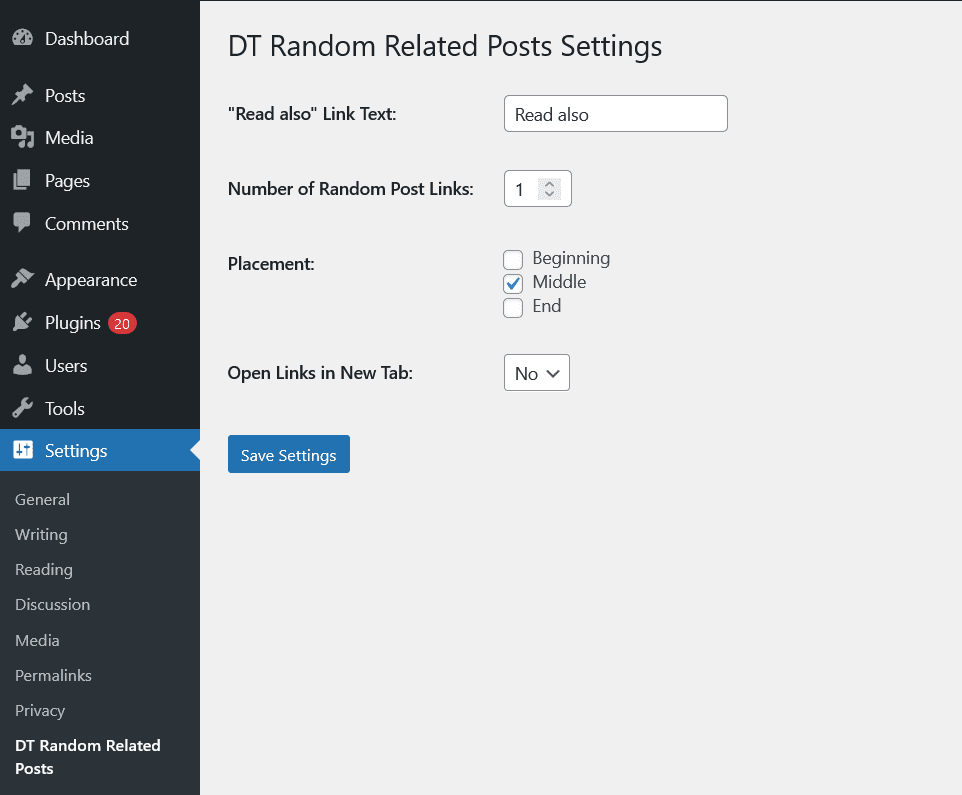 Settings > DT Random Related Postsfrom your WordPress dashboard. - In the settings page, you can: